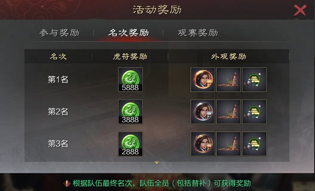 淘汰赛期间,每轮完成对局后,全队参赛成员可获得200虎符奖励,最多可参与6轮。同时,全队成员(包含替补)将根据队伍最终名次,获得淘汰赛排名奖励,最高可获得5888虎符大奖!