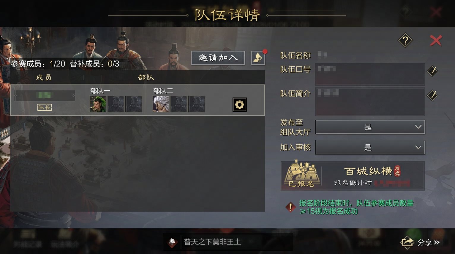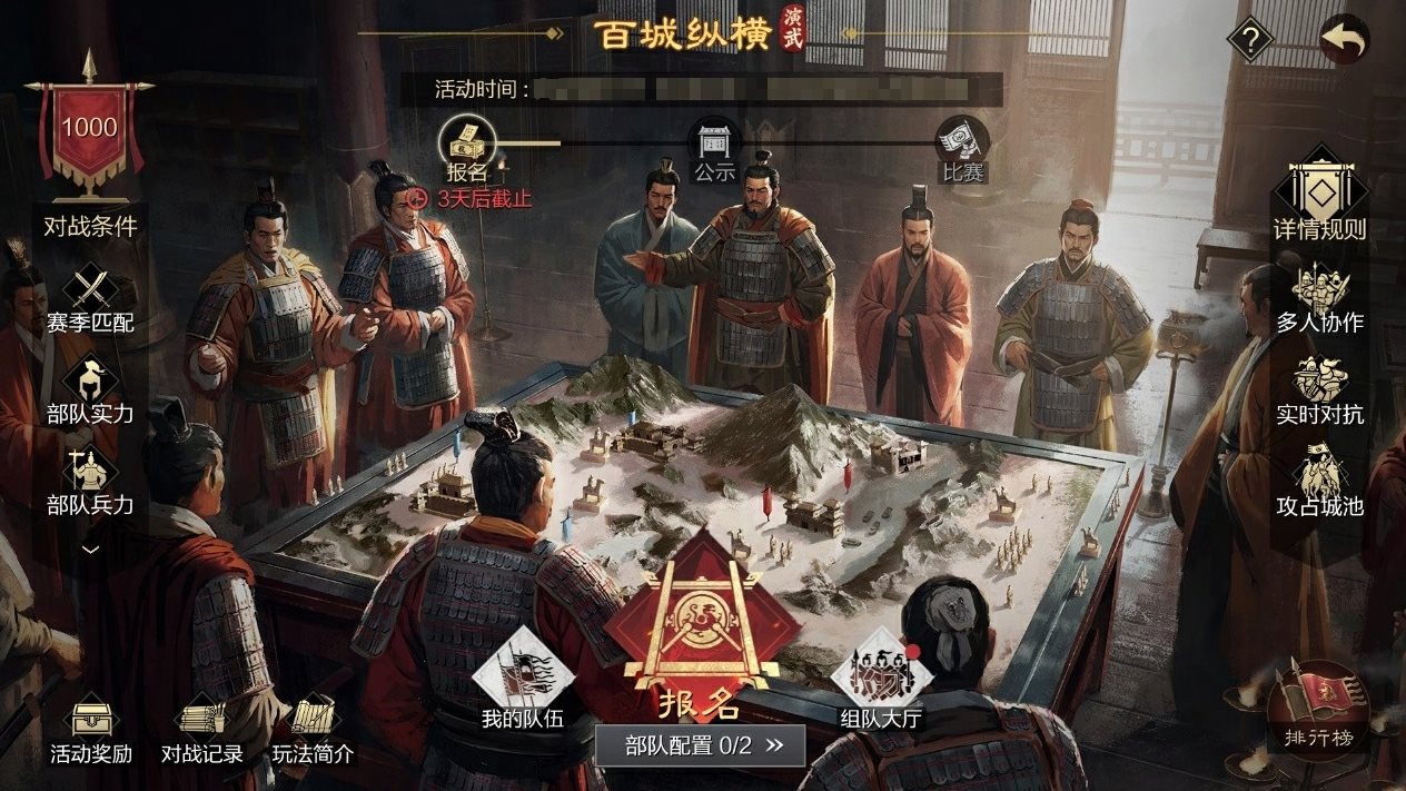 主公可组队报名参与《百城纵横》玩法,报名成功后,主公需利用自身的武将库以及战法库先行组建2支部队以参与后续的局内战斗。