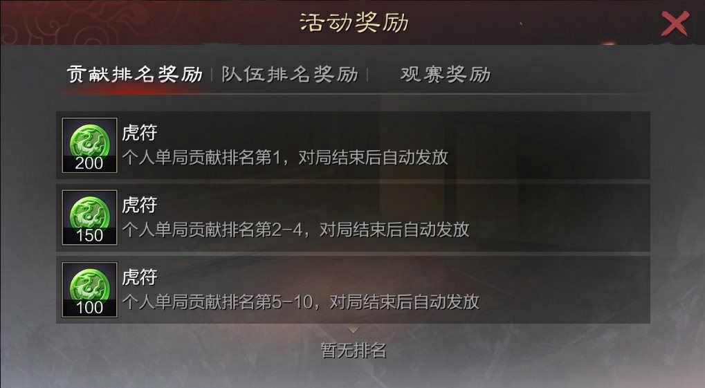 奖励分为单局排名奖励以及积分奖励。每周六、日完成对局后,根据单局的个人贡献排行以及队伍的对战名次发放奖励。个人贡献排名奖励最高可获得200虎符,队伍排名奖励最高可获得100虎符,两项奖励可叠加。