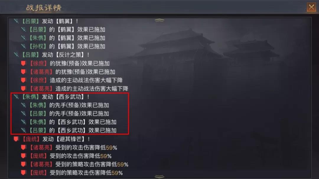 可以看到的是,吕蒙的【白衣渡江】中文本描述是“徐庶的策略攻击伤害效果已施加”,而SP朱儁【西乡武功】的描述却是“朱儁的【西乡武功】效果已施加”,这就是典型的常规型战法与触发型战法的区别。