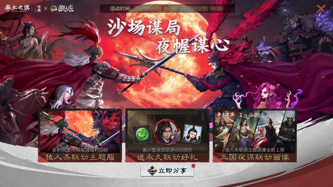 联动期间,将开启联动专区、联动主题服、率土百家·万人狼人杀、联动主题画像等系列活动