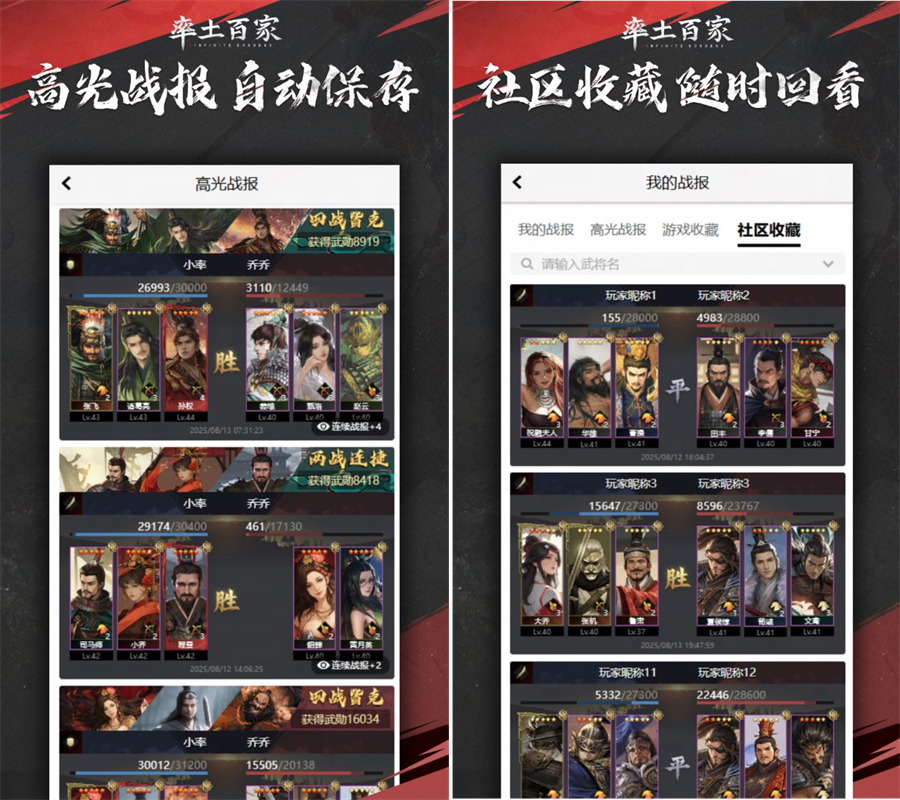 主公可以在百家社【我的战报】-【个人战报】中,查看对应登陆角色的最近3天近100封当前赛季全部战报,并且支持对战报进行分享、发帖、收藏。同时主公的近3个月的前100封连胜战报将自动同步于百家社【我的战报】-【高光战报】中,主公可以随时前往百家社进行查看。连胜战报自2025年8月8日起开始记录,在主公角色赛季变动后不会清除。