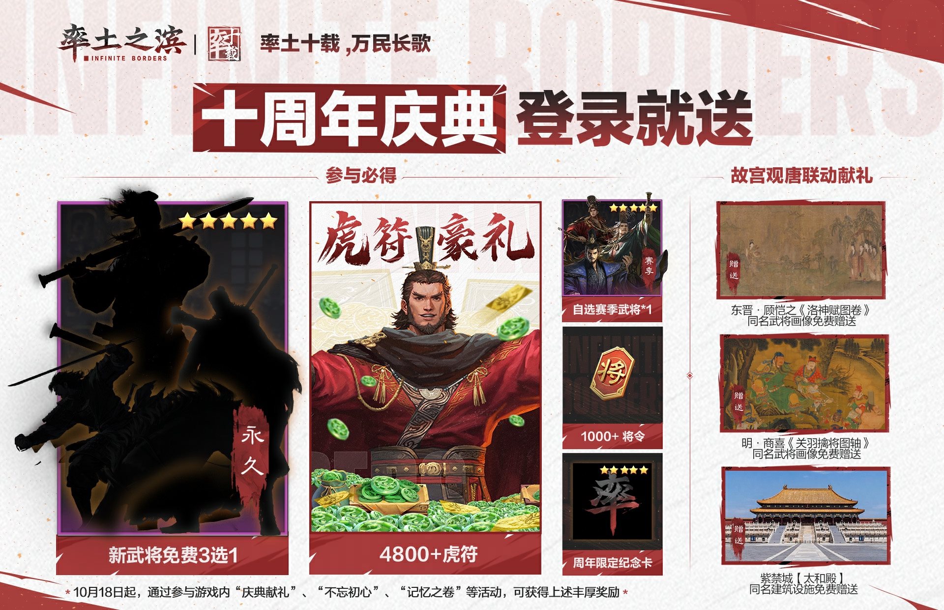 ·积极参与率土十载各个活动,即可积累周年献礼积分、提升周年献礼等级,参与庆典献礼,可免费获得3000虎符、1000将令、自选赛季武将、限时外观以及“百姓珍礼”宝箱;“百姓珍礼”宝箱最多可开启获得1022虎符。