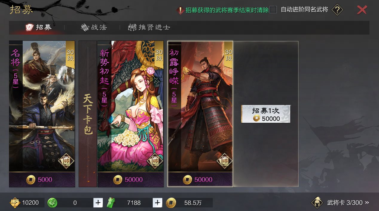 ·武将名帖将收入库藏中,有效期60天,使用后获得对应赛季武将