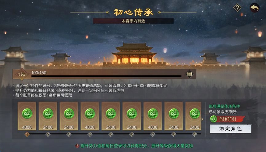 主公可通过每日登录和提升势力值来提升活动等级获得虎符,最快一周内即可拿满全部奖励(每个账号下只有1个角色可以领取本活动奖励)。