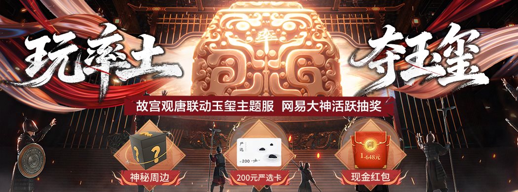活动说明:落地玉玺联动主题服,根据游戏登录天数和势力值发展情况,可在网易大神APP中获得抽奖机会。抽奖奖池内容包括:周边礼盒*1、200元网易严选卡、现金红包等奖励。