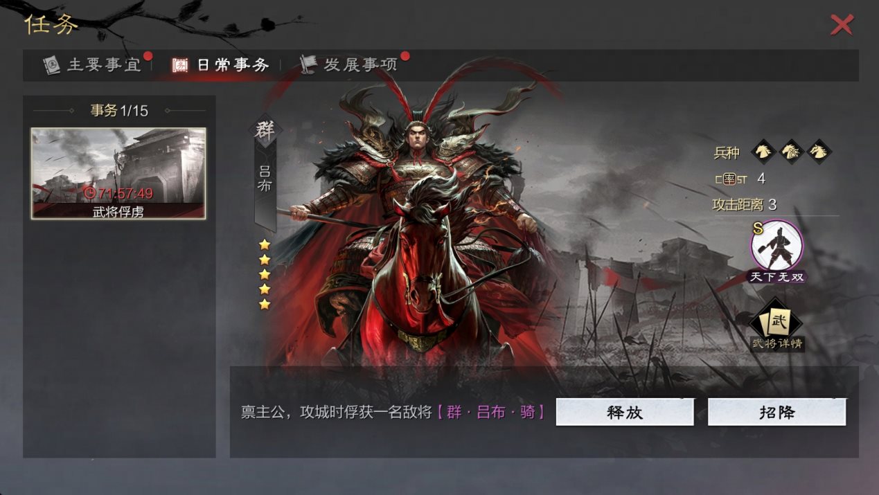 俘虏后招降的敌将为赛季武将,初始为20级,觉醒状态,且兵种已进阶。赛季结算时,赛季武将将自动清除,其学习的战法将自动遗忘。