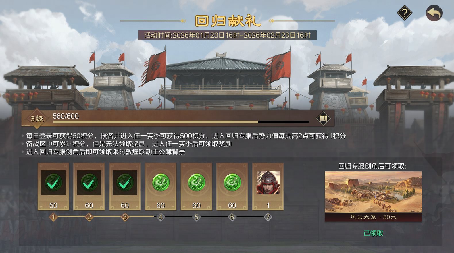 ··回归后通过登录、报名并进入赛季可累计积分,进入赛季后可继续通过提高势力值累计积分并领取虎符、五星侍卫卡奖励,若进入回归专服创角,可额外领取敦煌联动限时主公簿奖励