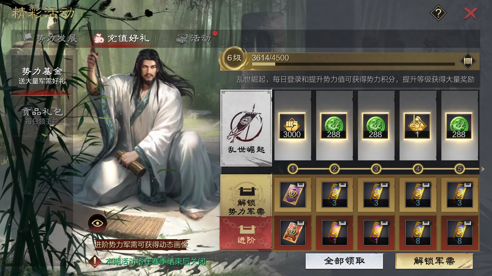 ·通过每日登录和提升势力值积累积分,积分将提升势力基金等级,获得3110虎符、大量战法经验奖励和5星卡包【国士无双】免费抽取次数,也可付费解锁更多武将画像、武将动态画像、招募信等奖励