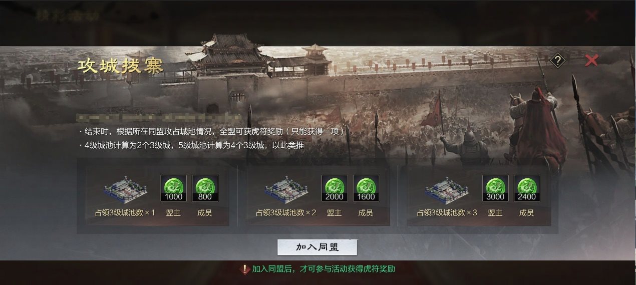 ·攻占3级或以上城池,全同盟成员可获得大量虎符奖励