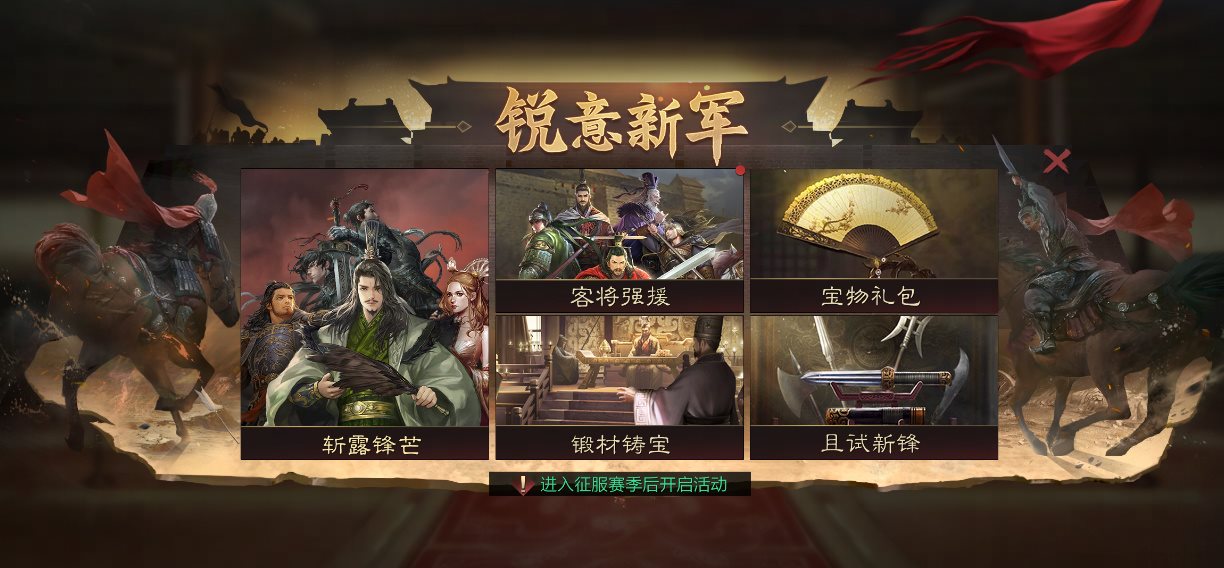 ·S2回归专服赛季结束后首次进入的[征服赛季]仍将开启“众心归附”活动,但是历史已激活“锐意新军”系列活动的主公无法再次开启“锐意新军”系列活动。