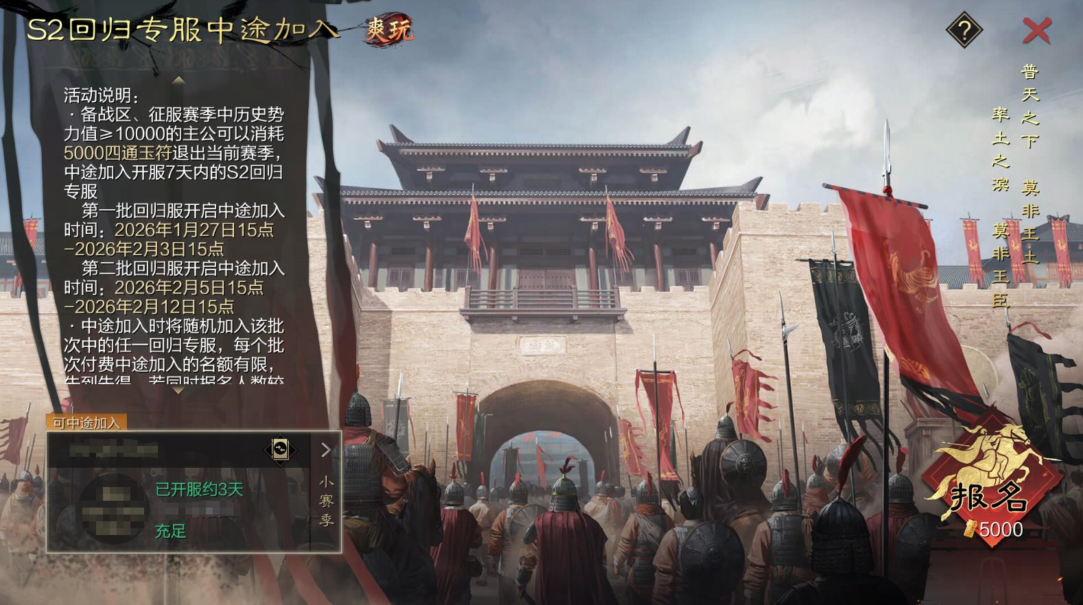 2026年1月27日15点-2026年2月12日15点期间,所有经典服备战区、征服赛季的玩家,将开启付费中途加入S2回归专服的活动,历史势力值≥10000的主公可以消耗5000四通玉符退出当前赛季,中途加入开服7天内的S2回归专服