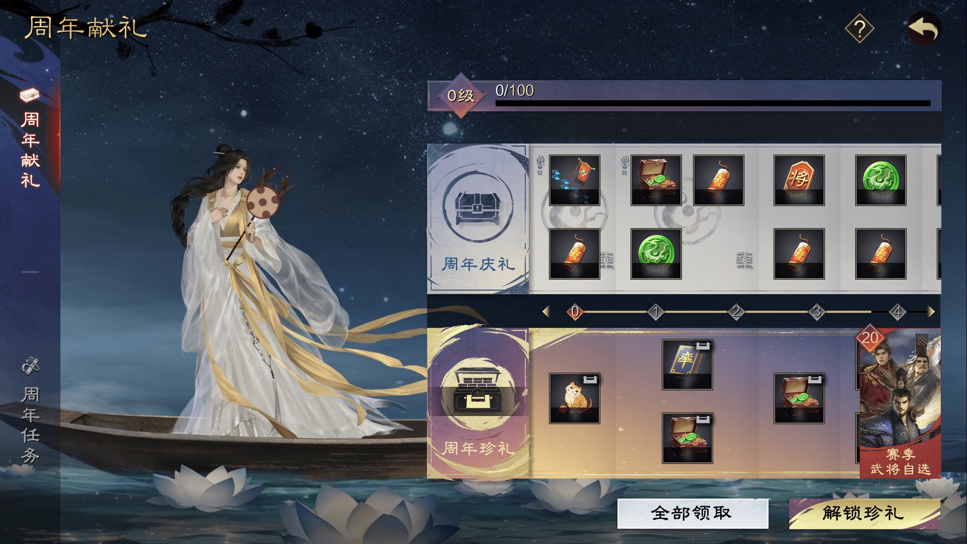 ·通过付费解锁周年珍礼,可以获得铜钱包、永久聊天气泡、自选赛季武将以及额外的“百姓珍礼”宝箱,使用铜钱包后可立即获得大量铜钱,可跨赛季保存铜钱包。