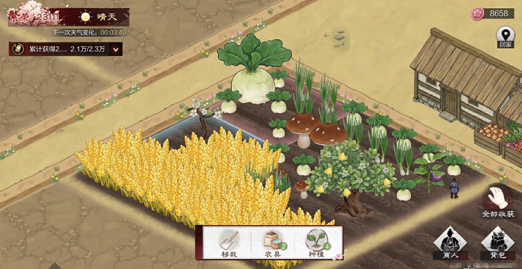 ·活动期间主公可在自己的桃源良田中,种植各类果蔬植物,果实成熟收获后可卖于云游商人,换取新的植物种子,或者农具;村内天气常有异象,经历特异天气而突变的果实会更珍贵;不断种植和收获,扩展更大的农田吧